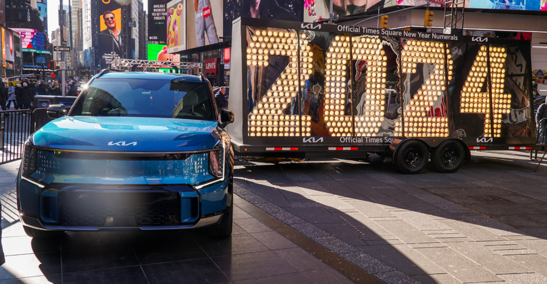 Los números “2024” fueron remolcados a Times Square por un nuevo SUV de tres filas totalmente eléctrico Kia EV9 del 2024, después de completar un viaje de costa a costa que comenzó en Los Ángeles a finales de noviembre.