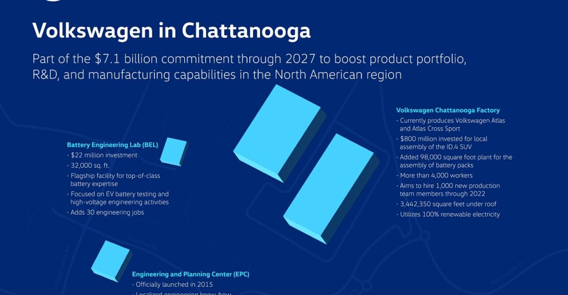Volkswagen ha invertido más de $800 millones de dólares para preparar su planta de Chattanooga para el ensamblaje local del SUV ID.4 en el 2022, incluidas instalaciones dedicadas para el ensamblaje de vehículos y paquetes de baterías.